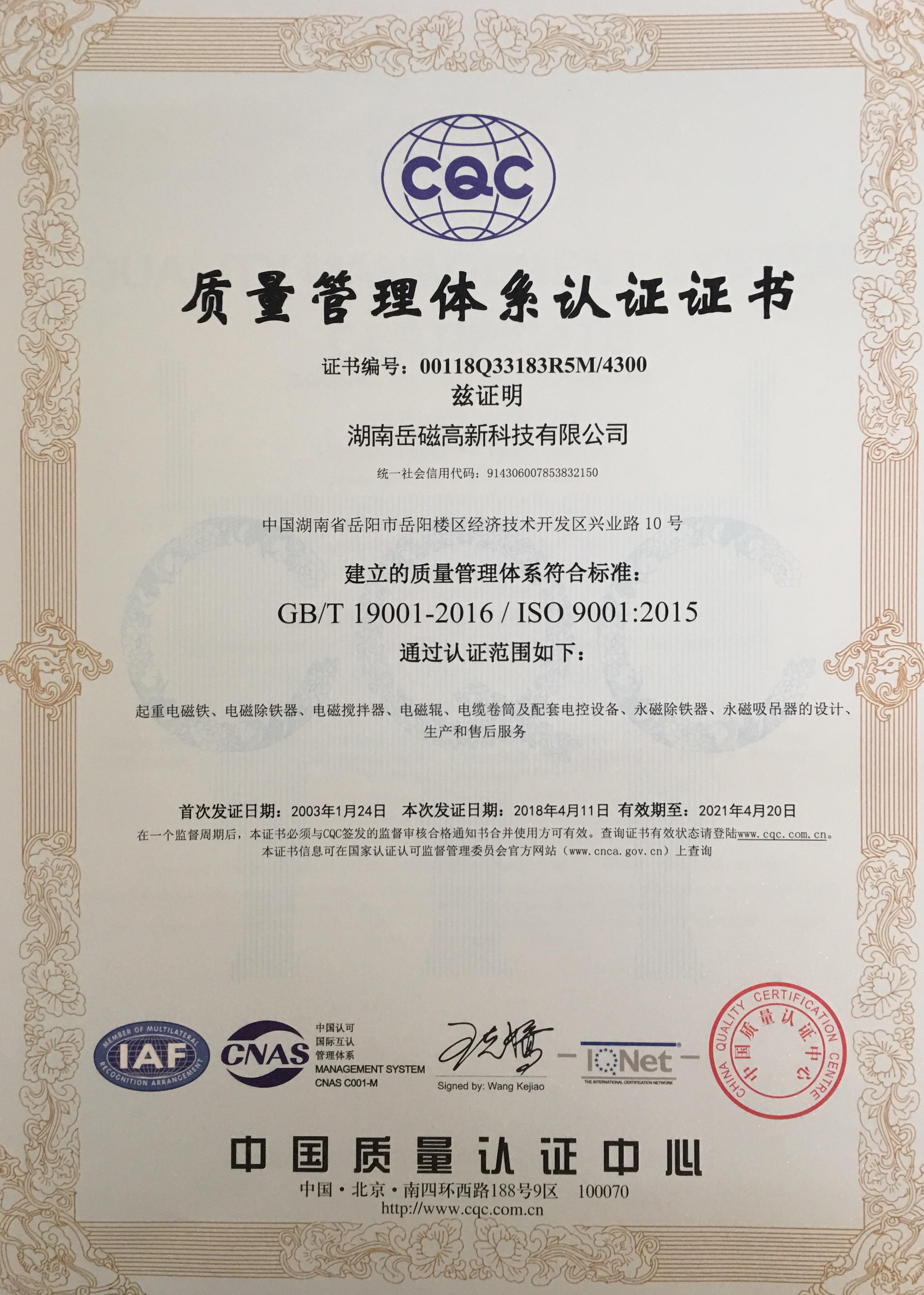 Quality Management System Certificate